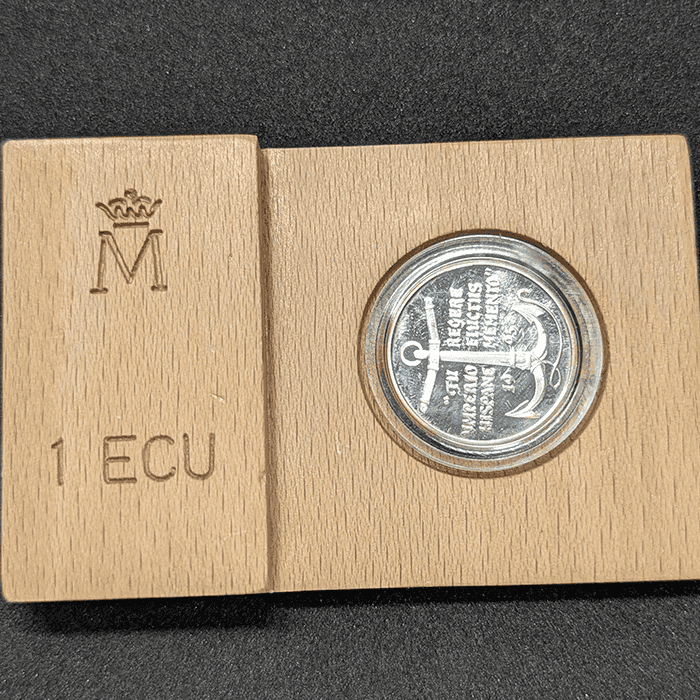 Acuñada por la Fábrica Nacional de Moneda y Timbre (F.N.M.T.) un lustro antes del cambio de milenio, esta elegante pieza de plata pertenece a la prestigiosa y buscada serie de ECUs concebida para homenajear el legado marítimo de España.
