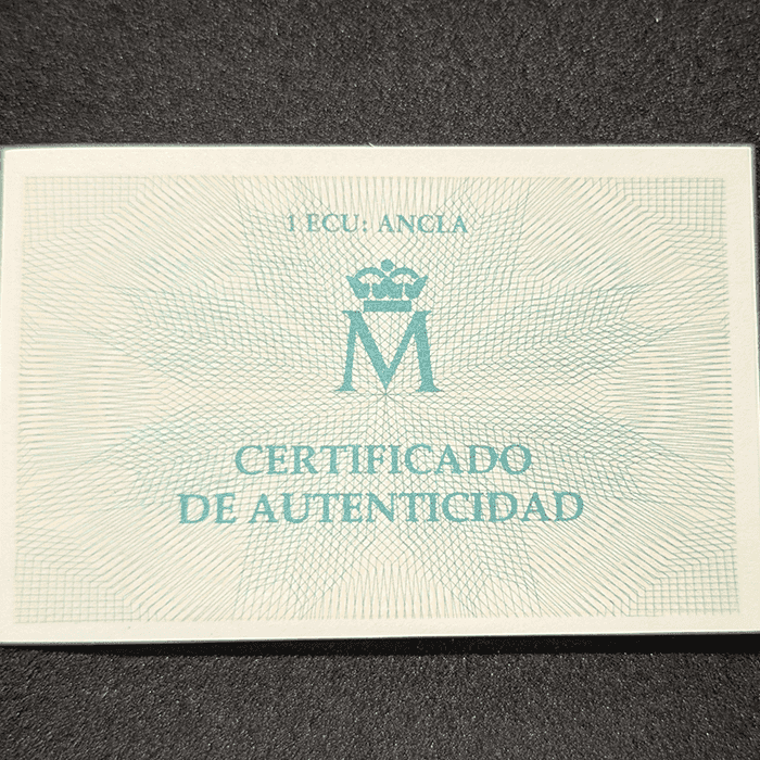 El diseño central es una verdadera joya artística: muestra el imponente relieve de un ancla antigua que divide una de las máximas latinas más poderosas de nuestra historia naval: «TU REGERE YMPERIO HISPANE FLUCTUS MEMENTO» (Acuérdate, España, de regir con tu imperio las olas). La moneda se entrega en un estado de presentación museístico: encapsulada de origen, alojada en su estuche original de madera de haya con tapa deslizante, acompañada de su certificado de autenticidad oficial («1 ECU: ANCLA») y resguardada por su característica funda de cartón azul con las estrellas europeas.