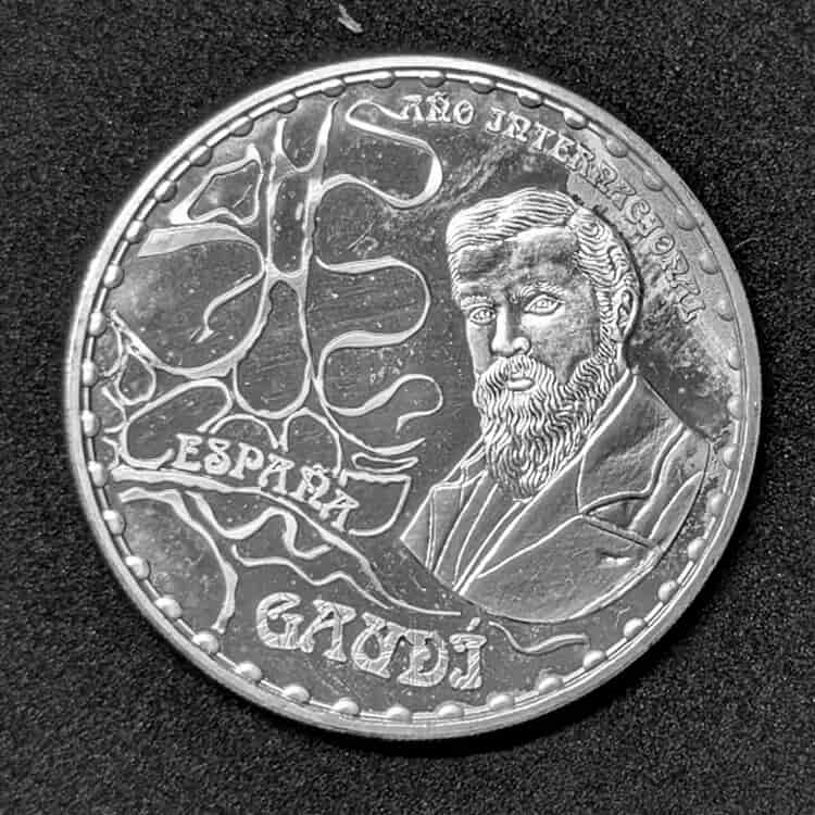 Acuñada por la Real Casa de la Moneda (FNMT) con motivo del Año Internacional de Gaudí en 2002 (en conmemoración del 150.º aniversario de su nacimiento), esta espléndida moneda es parte del trío de piezas de 10 euros que recuperan el histórico formato de los «8 Reales» de plata.