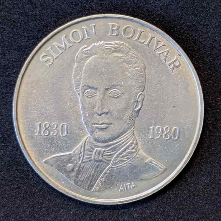 Esta imponente moneda de plata de 100 bolívares es una verdadera joya de la historia numismática contemporánea de Venezuela. Fue emitida de forma especial en 1980 para rendir homenaje a Simón Bolívar en el sesquicentenario (150 años) de su fallecimiento (1830-1980).