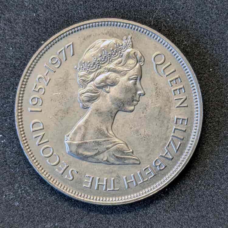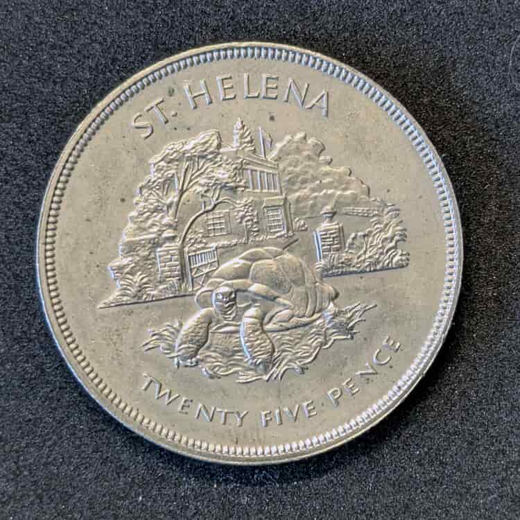 En 1977, todos los territorios de ultramar se unieron a las celebraciones por los 25 años en el trono de la reina Isabel II. La lejana y escarpada isla de Santa Elena, ubicada en medio del océano Atlántico Sur (y famosa históricamente por ser la prisión final de Napoleón Bonaparte), emitió para la ocasión esta imponente moneda de 25 peniques conservando el tradicional y contundente diámetro de las antiguas «Coronas» británicas.