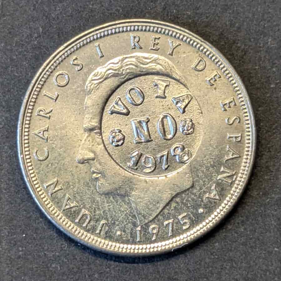 Sobre una moneda de curso legal de 5 pesetas (emisión 1975), un particular o grupo político estipuló un resello circular con la leyenda «VOTA NO 1978». Durante la campaña del referéndum, diversas facciones (principalmente la extrema derecha nostálgica del régimen anterior, y en menor medida, ciertos grupos de extrema izquierda) promovieron el «NO». Ante la falta de acceso a grandes medios, utilizaron el dinero circulante como panfletos indestructibles para propagar su mensaje de mano en mano.