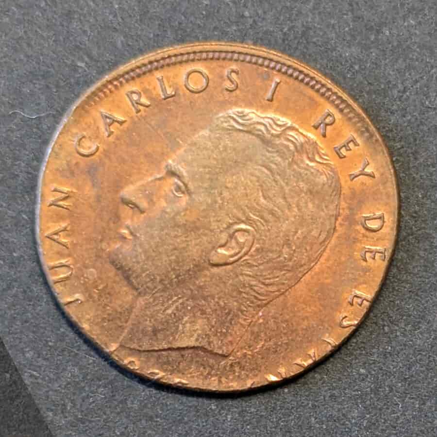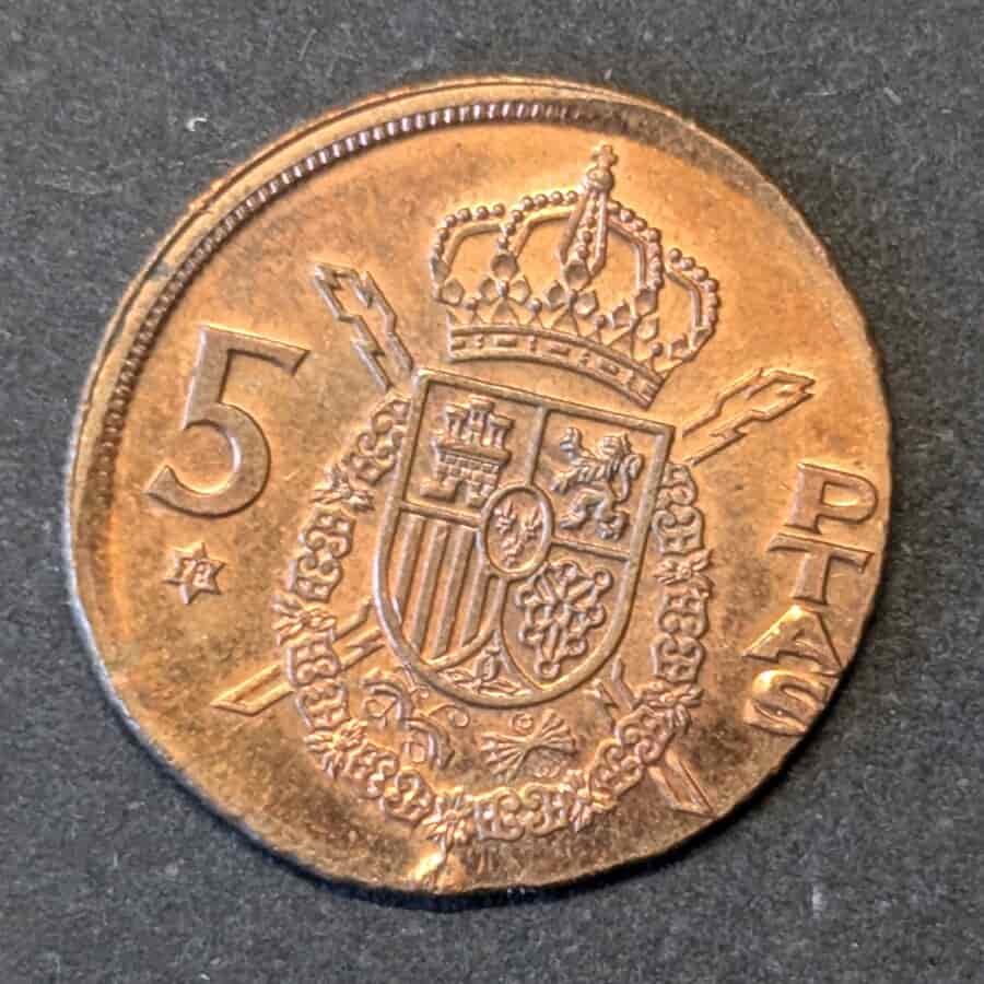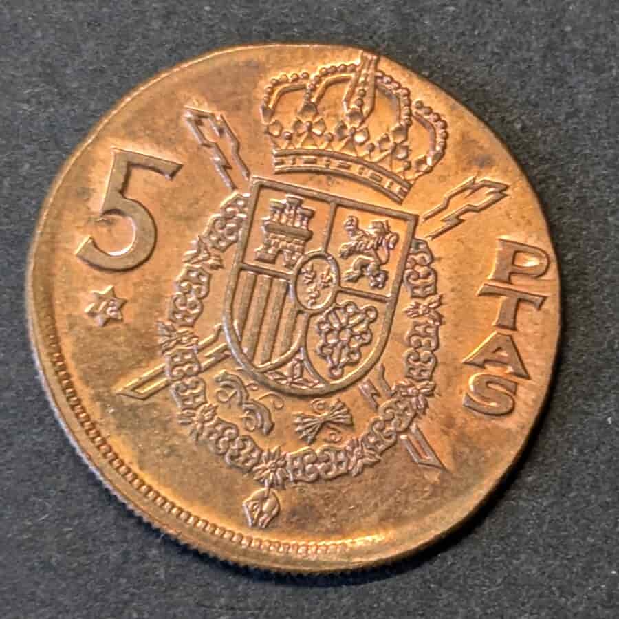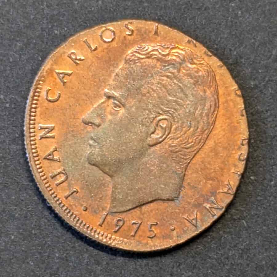 Ofrecemos una pieza que rompe la norma: una moneda de 5 pesetas de Juan Carlos I (Emisión 1975) que, a diferencia de la producción estándar en cuproníquel, presenta una coloración rojiza/cobriza completa y homogénea en ambas caras.