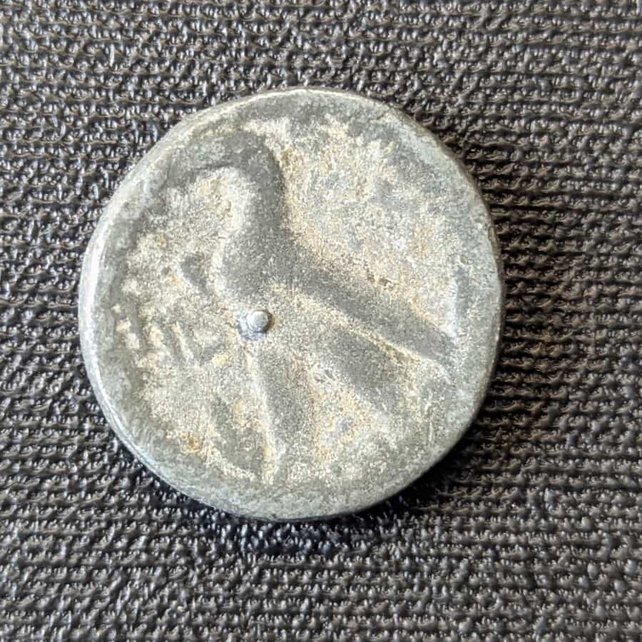 Reverso: Aparece el águila ptolemaica parada sobre un rayo, mirando a la izquierda. A la izquierda del campo, se intuyen restos de un símbolo (posiblemente una cornucopia o un monograma). Al igual que en el anverso, destaca el «agujero» central, vestigio del proceso de torneado del metal antes de ser acuñado.