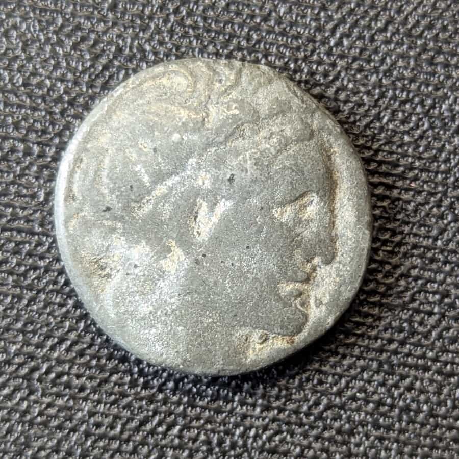 Anverso: Muestra la cabeza de Zeus-Amón mirando a la derecha. Aunque el relieve está suavizado por el tiempo, se distingue el perfil barbado y la curvatura del cuerno de carnero sobre la oreja, símbolo de la fusión entre el dios griego Zeus y el egipcio Amón. En el centro exacto, se aprecia una depresión circular (marca de centrado).