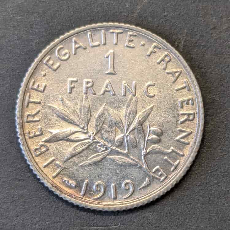 Reverso: Rodeado por el lema «Liberté, Égalité, Fraternité», aparece una rama de olivo (símbolo de paz) que envuelve el valor facial de 1 Franco y la fecha 1919.