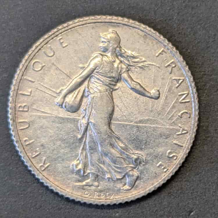 Preciosa moneda de plata (.835) de la República Francesa. Acuñada en 1919 con el célebre diseño Art Nouveau de «La Sembradora» (La Semeuse) de Oscar Roty. Un clásico indispensable de la numismática europea.