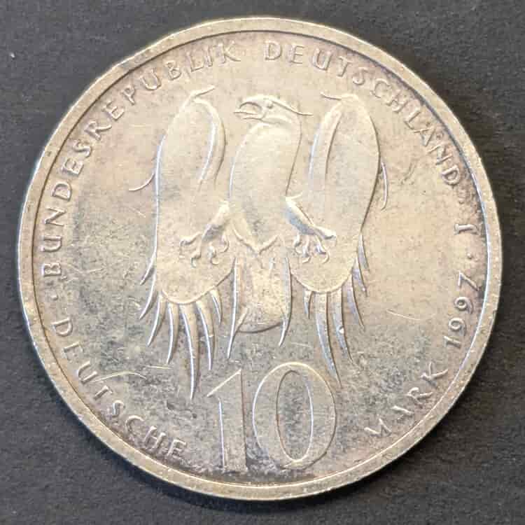 Reverso: Muestra el Águila Federal (Bundesadler) en una versión estilizada y vanguardista, típica del diseño numismático alemán de finales de los 90. Incluye la marca de ceca «J» (Hamburgo) y el valor facial 10 DEUTSCHE MARK.