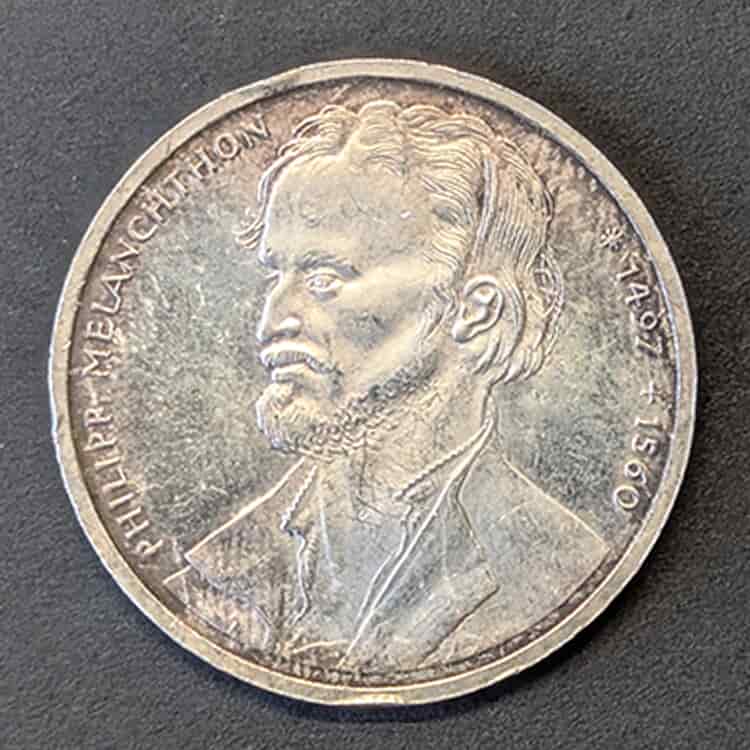 Anverso: Presenta un retrato de perfil de Melanchthon de estilo renacentista pero con trazos modernos, destacando su característica barba y mirada intelectual. Leyenda: «PHILIPP MELANCHTHON * 1497 + 1560».