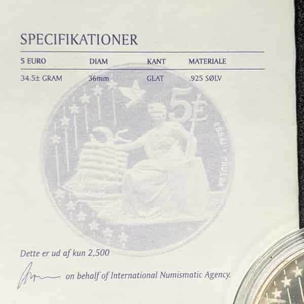 El euro danés que se quedó en un sueño En el año 2000, Dinamarca decidió en referéndum no adoptar el euro, manteniendo su histórica corona. Para satisfacer a los coleccionistas europeos, la prestigiosa International Numismatic Agency (INA) acuñó en 2002 esta deslumbrante pieza de fantasía (ensayo o prueba) mostrando cómo podría haber lucido la moneda única en el país escandinavo. Esta edición en concreto es un codiciado «Piedfort» (acuñada con el doble de grosor y peso habitual), lo que le confiere una rotundidad y una presencia espectaculares en mano.