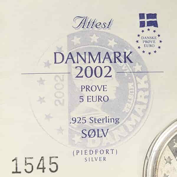 Moneda de prueba de 5 euros de plata de Dinamarca (2002) – Ensayo Piedfort
