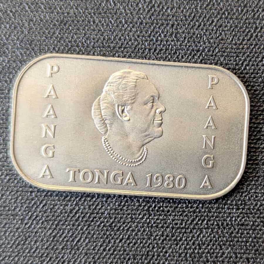 Tonga es mundialmente conocida en la numismática por sus atrevidas emisiones de formas no convencionales. Esta pieza rectangular de 1 Pa’anga es un magnífico ejemplo de esa tradición, acuñada bajo el reinado de Taufa’ahau Tupou IV.