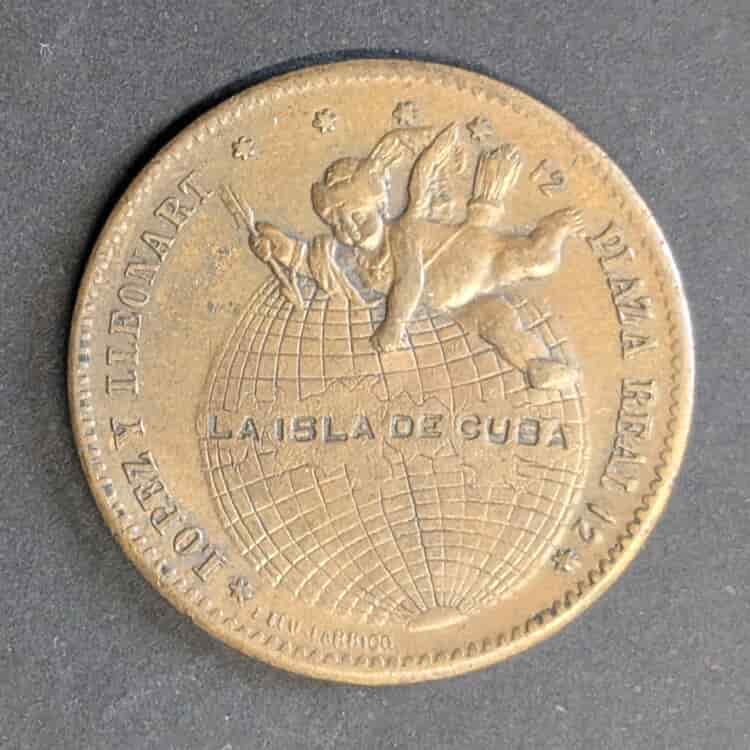 Escasa medalla publicitaria (token) del siglo XIX emitida por la joyería López y Lleonart de la Plaza Real de Barcelona. Destaca por su reverso con un querubín señalando «La Isla de Cuba» en un globo terráqueo. Una pieza clave de la historia de los «Indianos» y el comercio ultramarino.