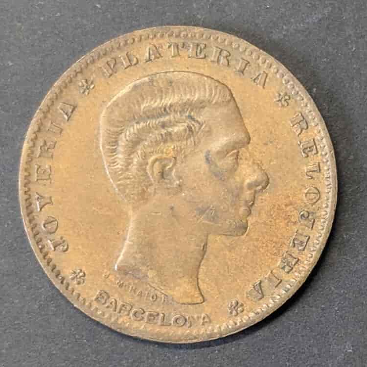 Anverso: Presenta un busto masculino de perfil (posiblemente inspirado en la realeza de la época o un caballero distinguido), firmado por el grabador B. Morató (Bernardo Morató, grabador activo en Barcelona a finales del s. XIX). Rodeado por la actividad del negocio: «Joyería, Platería y Relojería * Barcelona».