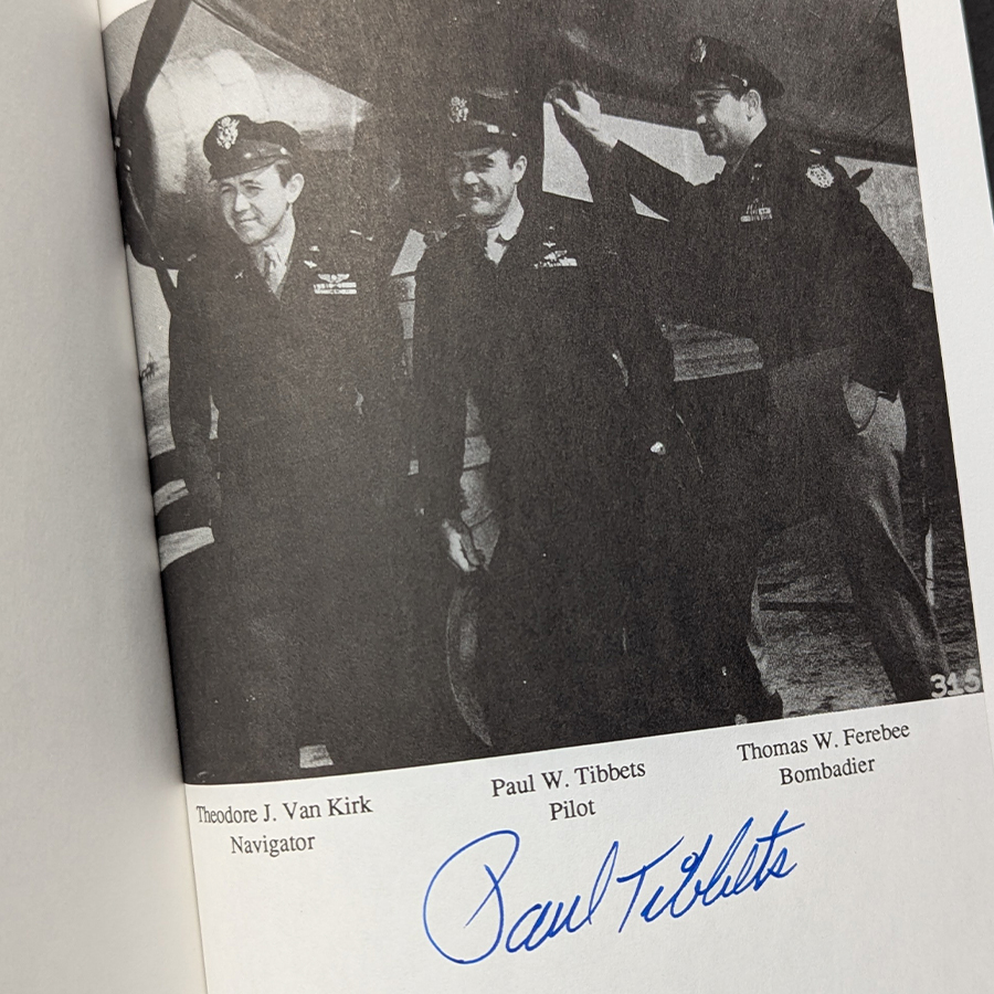 El libro incluye la firma original de Tibbets en la página interior, bajo su fotografía junto a la tripulación (el navegador Theodore J. Van Kirk y el bombardero Thomas W. Ferebee). Encontrar un ejemplar firmado y en condiciones tan prístinas es extremadamente difícil, lo que convierte a este artículo en una inversión segura y una pieza central para cualquier biblioteca de la Segunda Guerra Mundial.