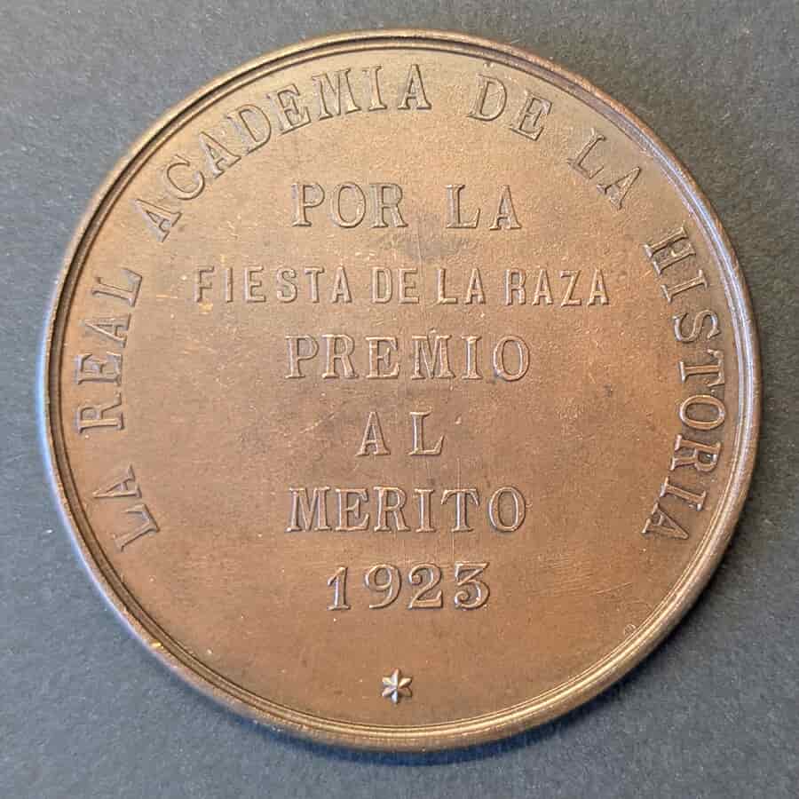 Solemne medalla académica otorgada en 1923. Acuñada por la Real Academia de la Historia como «Premio al Mérito» en el contexto de la Fiesta de la Raza. Anverso con bella alegoría de la Historia y reverso con leyenda conmemorativa.