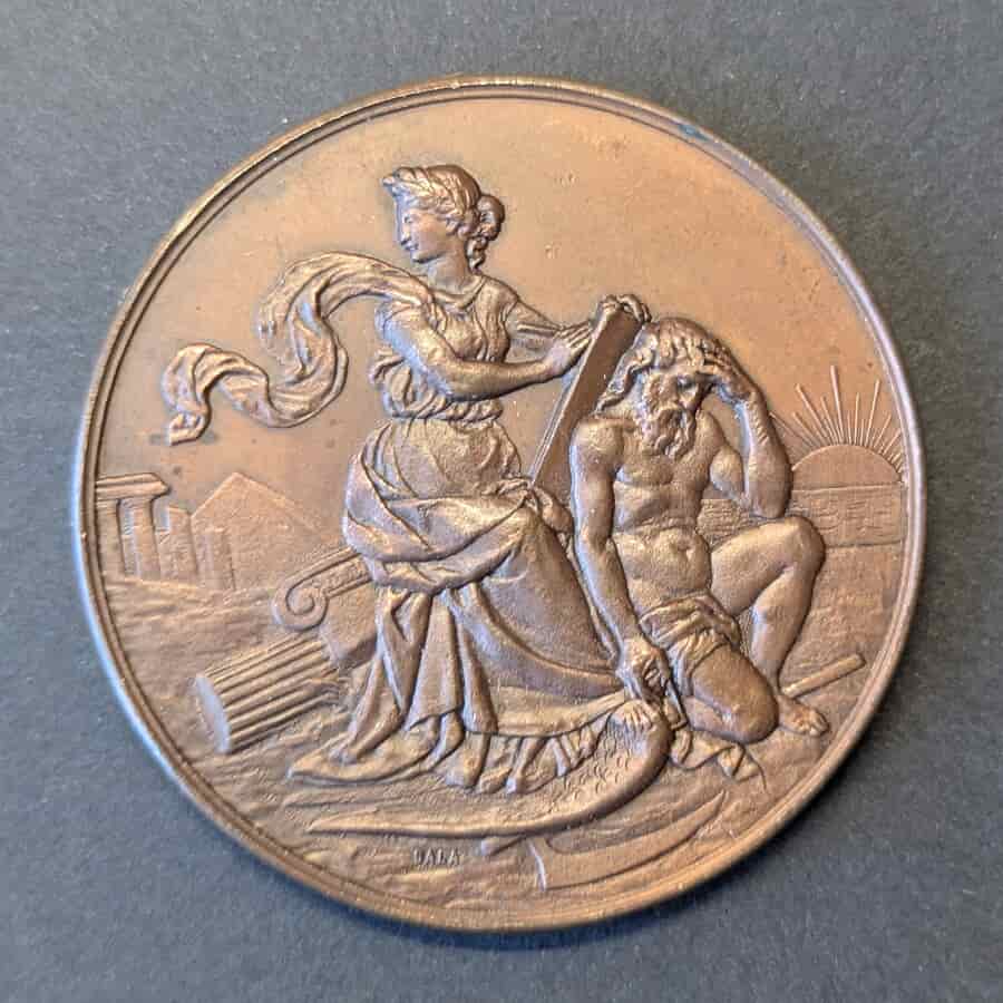 Estado de Conservación: Muy Bueno (MBC+/EBC). El relieve de las figuras del anverso es excelente, conservando los detalles de los pliegues de la ropa y la musculatura. El campo tiene una tonalidad marrón chocolate mate muy atractiva. Los bordes parecen sanos.