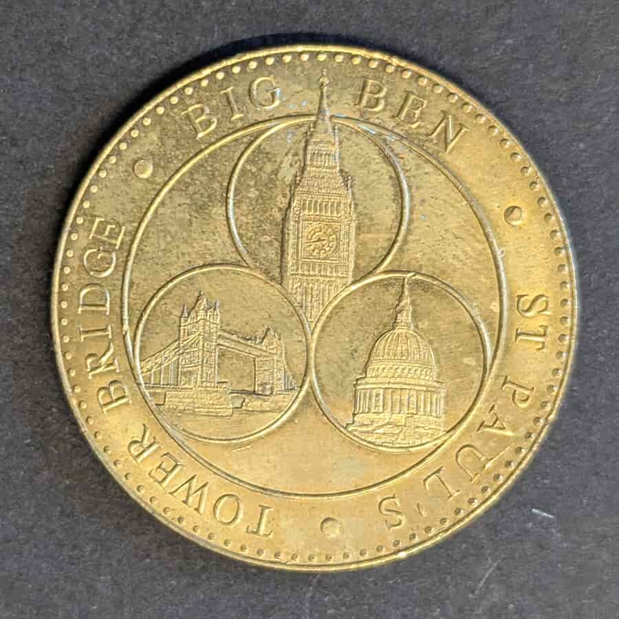 Londres en la palma de tu mano. Este token conmemorativo de 2018 reúne los cuatro grandes iconos de la capital británica en una sola pieza. Un recuerdo dorado perfecto de la ciudad del Támesis, ideal para completar tu colección de viajes.